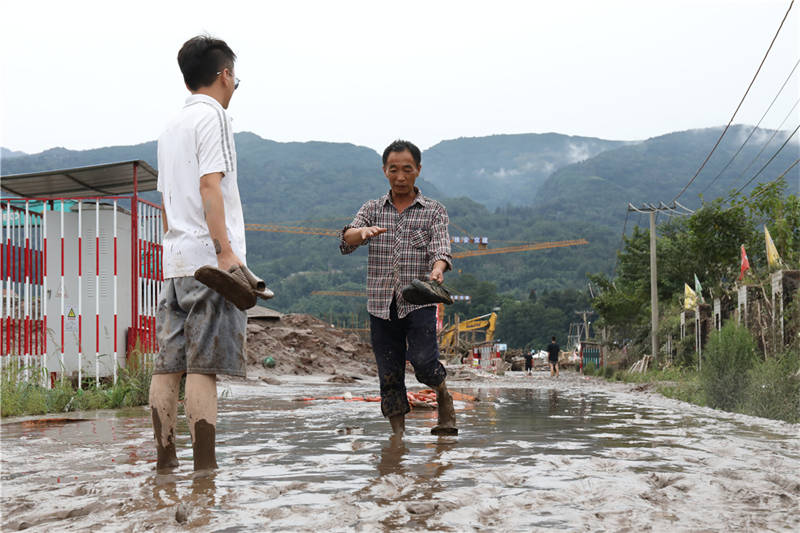 8月18日下午,在草壩青衣江大橋建設(shè)現(xiàn)場,項目部外的院壩、工地附近的道路,均覆蓋著厚厚的淤泥!白蛲砭o急撤離,我的車停在河邊,也沒來得及開走,現(xiàn)在都沒找到!币荒樒v的李勁松告訴記者,雖然洪水漲勢迅猛,但他們撤離之前,提前通知了電力部門斷電,否則若有人再次靠近洪水,將面臨觸電的風(fēng)險。