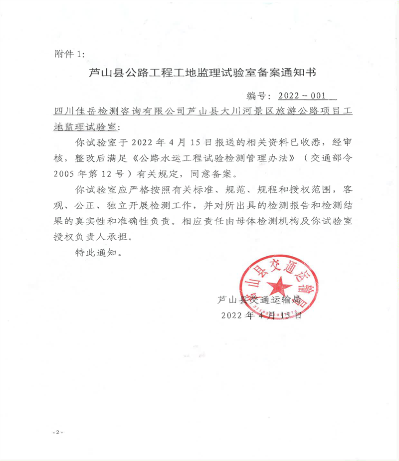 交建佳岳公司取得蘆山大川河景區(qū)旅游公路項目檢測授權(quán)