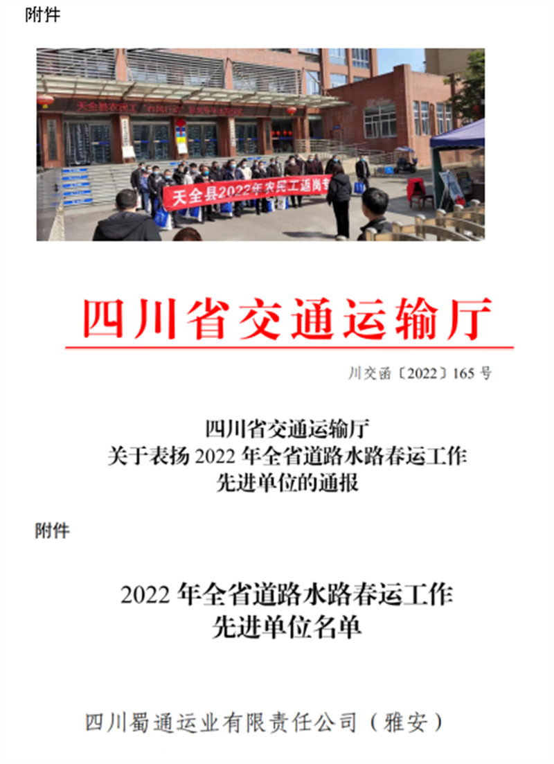 蜀通公司認真落實各級政府和行業(yè)主管部門有關(guān)春運工作的安排部署,堅持以“冬安行動”為抓手,全力以赴做好春運期間運輸安全和疫情防控,確保全市交通運輸暢通、民生出行順利。2022年春運期間,共投入班線車輛16546臺,發(fā)班21269班次,其中加班422班次,安全運送旅客26余萬人次,圓滿完成2022年春運工作,被四川省交通運輸廳評為“2022年全省道路水路春運工作先進單位”。