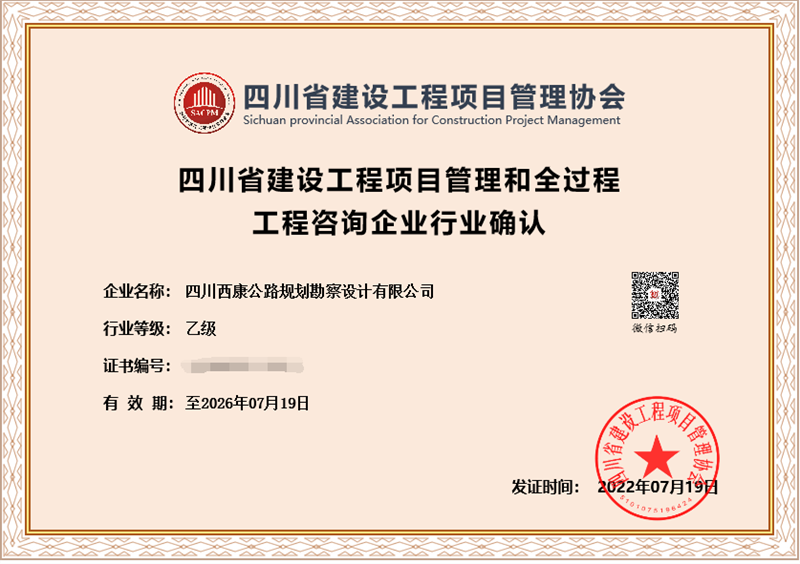 交建勘察設(shè)計(jì)公司取得四川省建設(shè)工程項(xiàng)目管理和全過(guò)程工程咨詢企業(yè)行業(yè)乙級(jí)資質(zhì)