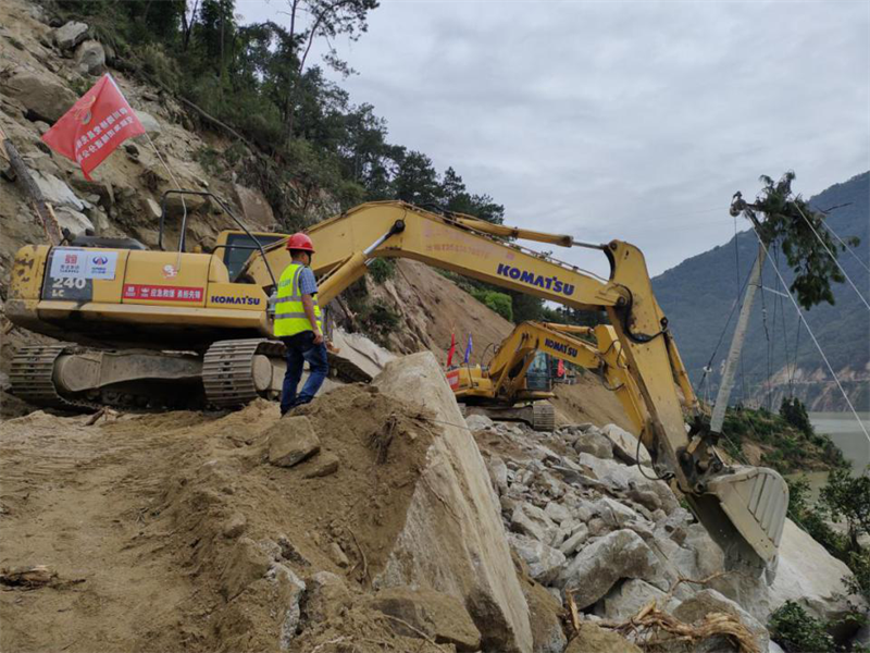 搶險隊伍,馬上出發(fā)!集團領(lǐng)導(dǎo)班子立即召開碰頭會,分析研判形勢,安排部署工作,密切關(guān)注震區(qū)態(tài)勢,成立抗震救災(zāi)領(lǐng)導(dǎo)小組,副總經(jīng)理鐘焱宇率現(xiàn)場指揮組趕赴石棉靠前指揮搶險救災(zāi)。正在石棉G108線施工的康藏路橋公司項目部組成10人搶險救援小分隊,攜帶挖掘機4臺、拖車4臺、裝載機3臺、交通運輸車2輛、無人機1臺,第一時間到就地?fù)岆U工作,震后7小時,完成國道G108線馬富至菩薩崗約40公里路段、6處塌方點1600余方土石方清理,爾后轉(zhuǎn)戰(zhàn)石棉縣新民鄉(xiāng)進行通鄉(xiāng)道路搶通作業(yè)。
