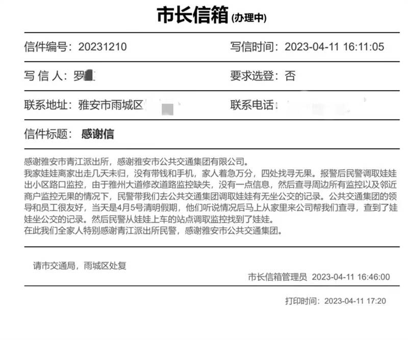 日前,市民羅女士的孩子離家出走,四處尋找無果。4月5日,時(shí)值清明假期,羅女士來到公交集團(tuán),希望工作人員幫忙查詢孩子乘坐公交車的記錄。得知情況后,公交集團(tuán)值班人員立即通知相關(guān)技術(shù)人員到崗到位,根據(jù)羅女士提供的戶口簿信息,通過后臺查詢到孩子使用學(xué)生卡在市區(qū)乘坐公交車的記錄及相關(guān)車輛的監(jiān)控視頻,并會同公安干警完整梳理出孩子的活動軌跡,不到半個(gè)小時(shí),成功協(xié)助家長找到離家出走的孩子。事后羅女士帶著感恩之情和禮物,專程到公交集團(tuán)表示感謝,公交集團(tuán)工作人員婉言謝絕了羅女士的禮物。隨后,羅女士在市長信箱寫下了這封誠摯的感謝信。