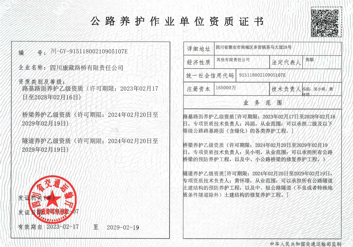 近日,雅安市交通建設(集團)有限責任公司通過自主申報,成功通過四川省交通運輸廳公路養(yǎng)護作業(yè)單位資質(zhì)評審,完成公路養(yǎng)護作業(yè)單位資質(zhì)增項,新增橋梁養(yǎng)護乙級、隧道養(yǎng)護乙級兩項資質(zhì)。