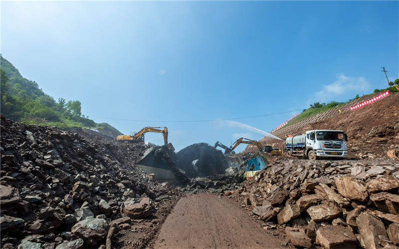 上午10點(diǎn),金雞關(guān)隧道開(kāi)挖現(xiàn)場(chǎng),多臺(tái)大型破碎機(jī)和灑水除塵設(shè)備同時(shí)按下啟動(dòng)鍵,建設(shè)的“沖鋒號(hào)”奏響。金雞關(guān)隧道開(kāi)挖是整個(gè)項(xiàng)目取得突破性進(jìn)展的標(biāo)志,是路基鋪設(shè)和邊坡抗滑裝等施工開(kāi)展的基礎(chǔ)。目前土方開(kāi)挖已完成365萬(wàn)方,邊坡施工已完成8級(jí),項(xiàng)目整體推進(jìn)有序,預(yù)計(jì)兩個(gè)月完成隧道部分開(kāi)挖。