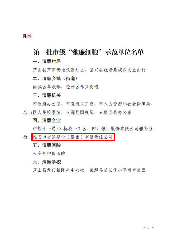 經過雅安市黨風廉政建設責任制領導小組辦公室嚴格考評審定,雅安市交通建設(集團)有限責任公司被命名為第一批市級“雅廉細胞”示范單位(清廉企業(yè))。