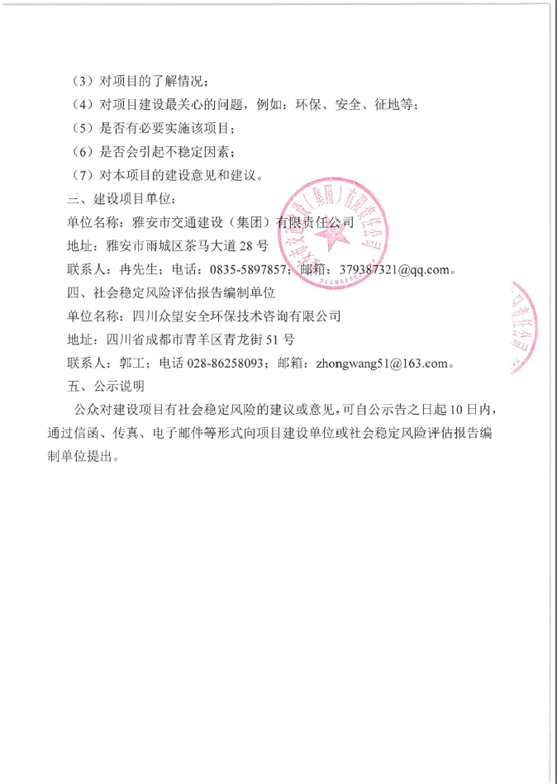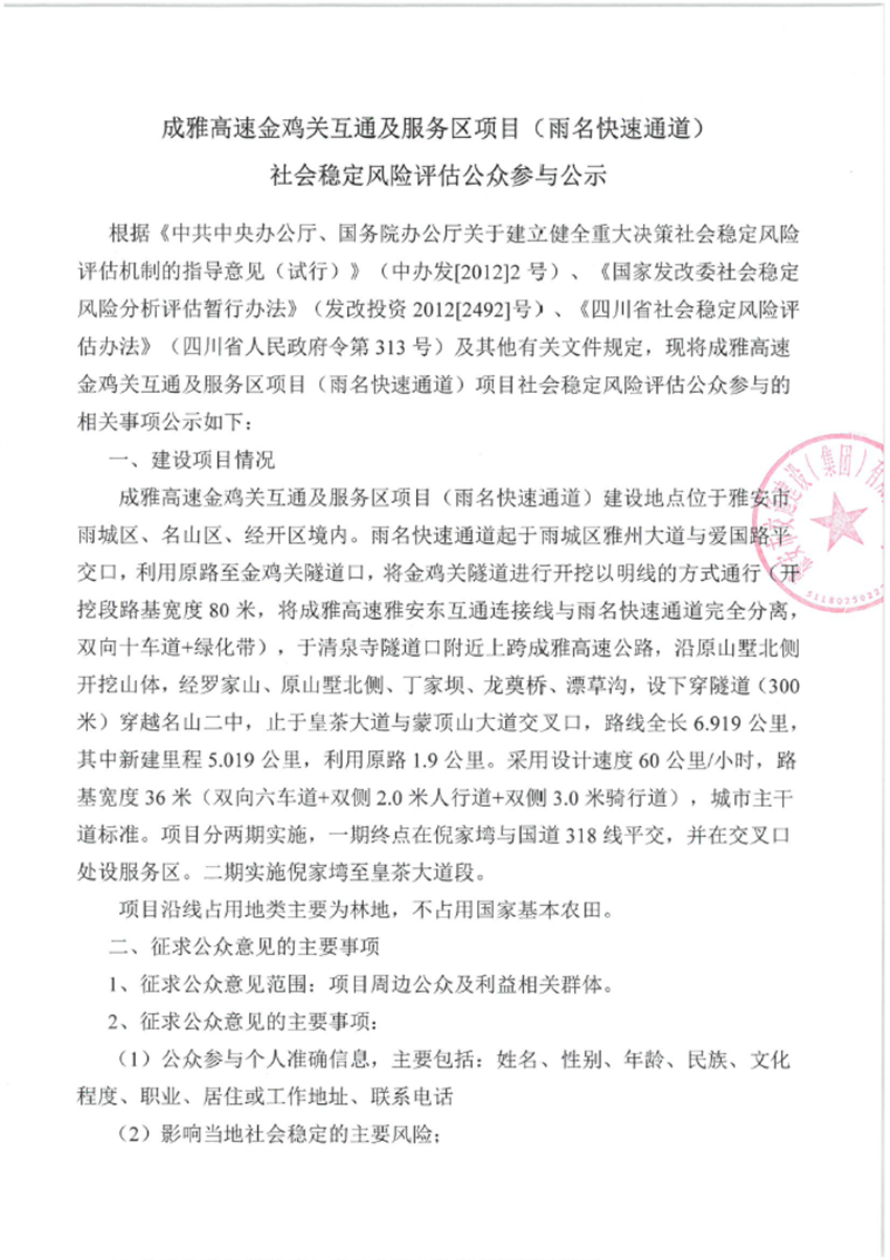 成雅高速金雞關(guān)互通及服務(wù)區(qū)項(xiàng)目(雨名快速通道)社會(huì)穩(wěn)定風(fēng)險(xiǎn)評(píng)估公眾參與公示