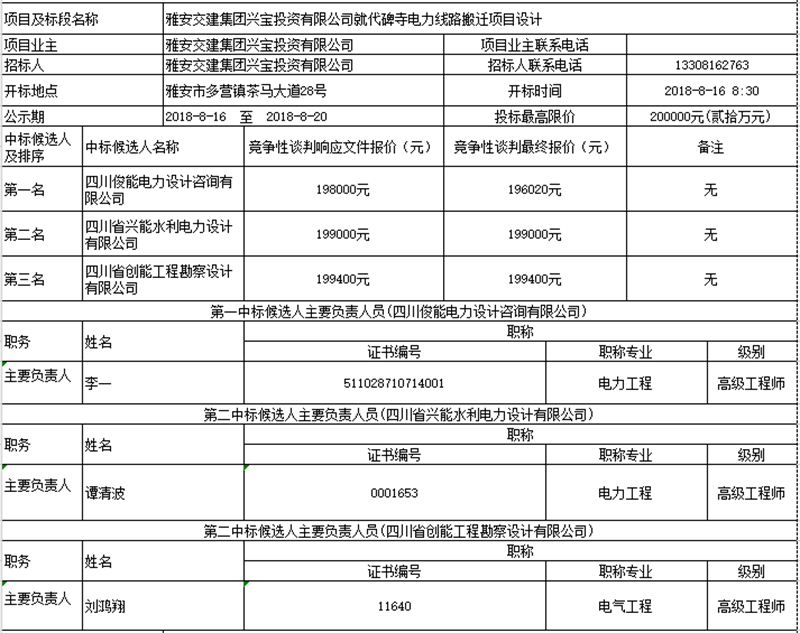 雅安交建集團(tuán)興寶投資有限公司就代碑寺電力線路搬遷項(xiàng)目設(shè)計(jì)競(jìng)爭(zhēng)性談判中標(biāo)候選人公示