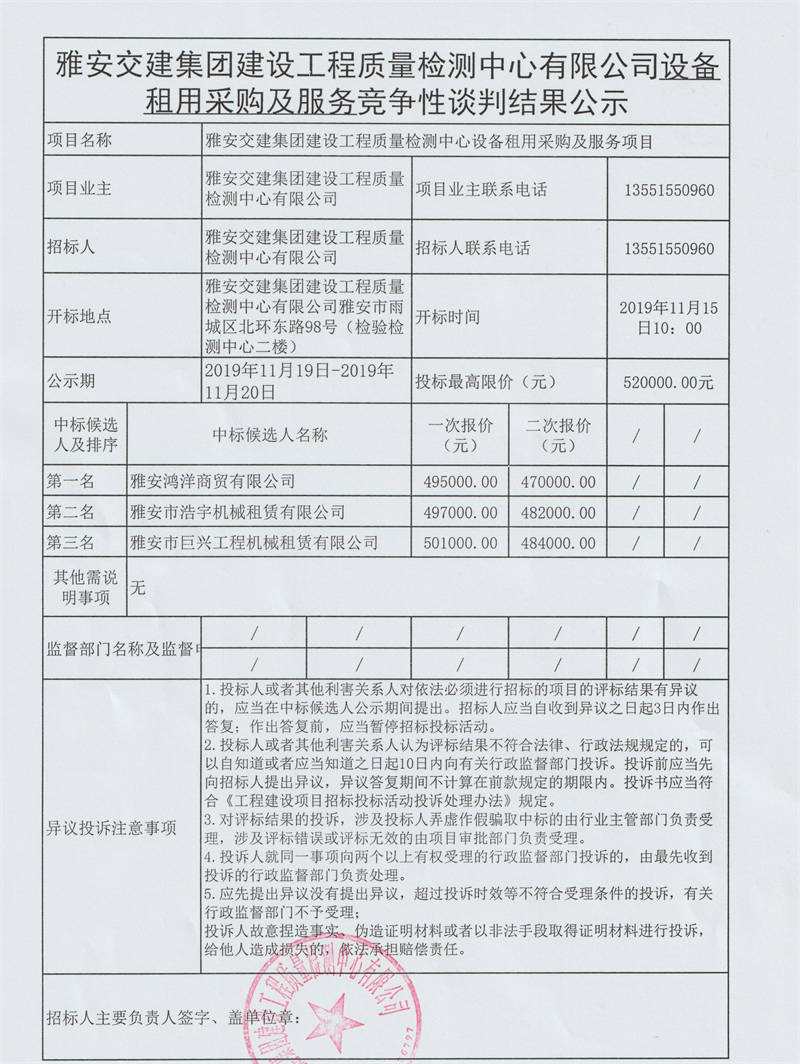 雅安交建集團(tuán)建設(shè)工程質(zhì)量檢測中心有限公司設(shè)備租用采購及服務(wù)競爭性談判結(jié)果公示