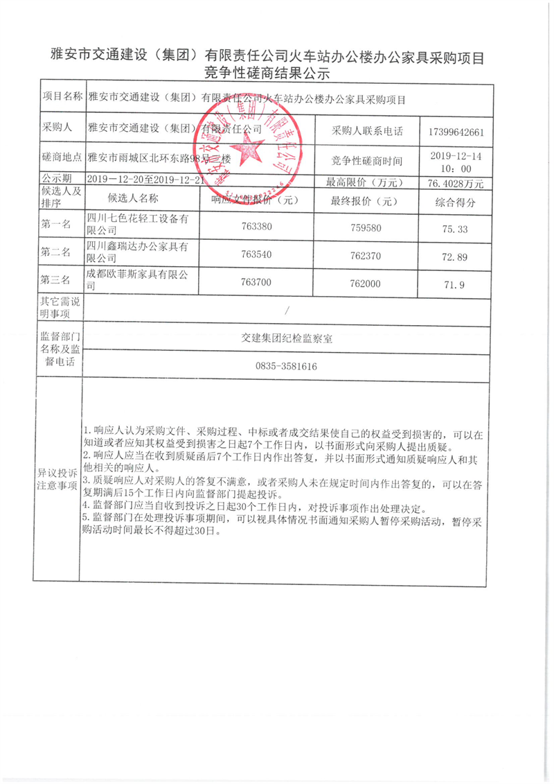 雅安市交通建設(shè)(集團)有限責(zé)任公司火車站辦公樓辦公家具采購項目競爭性磋商結(jié)果公示