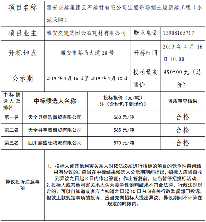寶盛砂場(chǎng)擋土墻新建工程(水泥采購(gòu))項(xiàng)目競(jìng)爭(zhēng)性談判結(jié)果公示