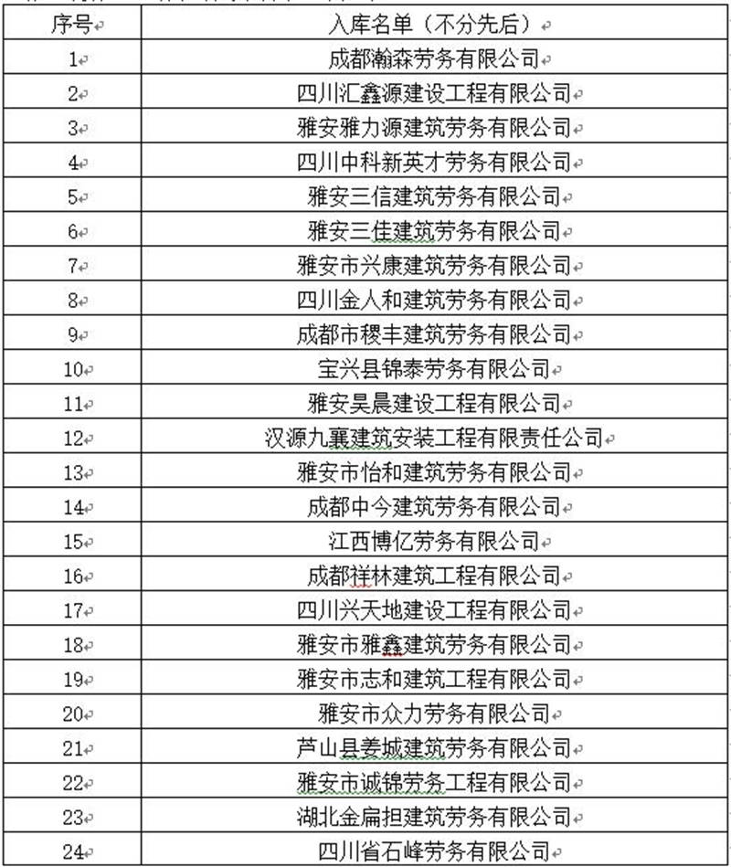 雅安交建集團路橋有限責任公司勞務(wù)服務(wù)入庫比選項目于2019年5月11日完成開評標工作,現(xiàn)將比選結(jié)果即入庫名單公示如下: