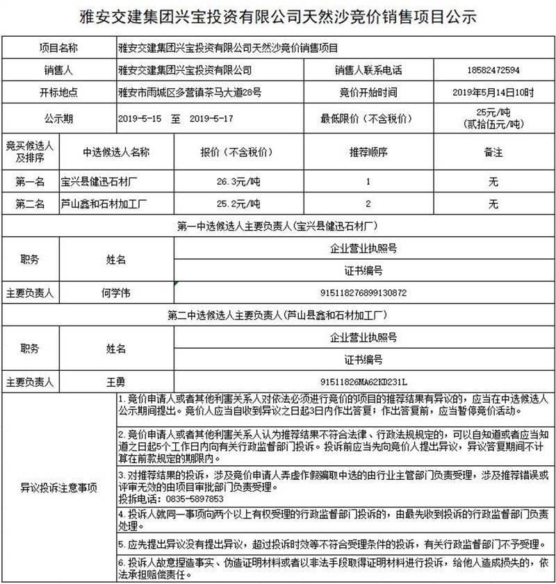 雅安交建集團(tuán)興寶投資有限公司天然沙競(jìng)價(jià)銷(xiāo)售項(xiàng)目公示