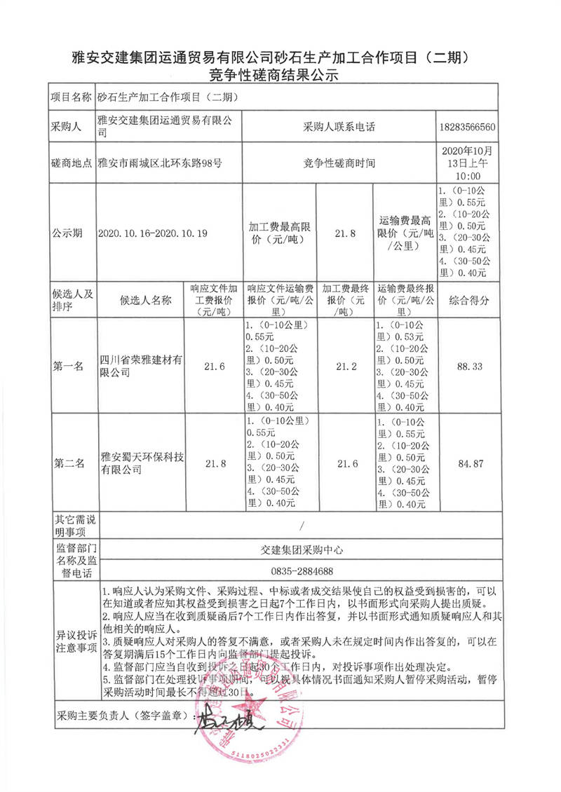 雅安交建集團運通貿(mào)易有限公司砂石生產(chǎn)加工合作項目(二期)競爭性磋商結(jié)果公示