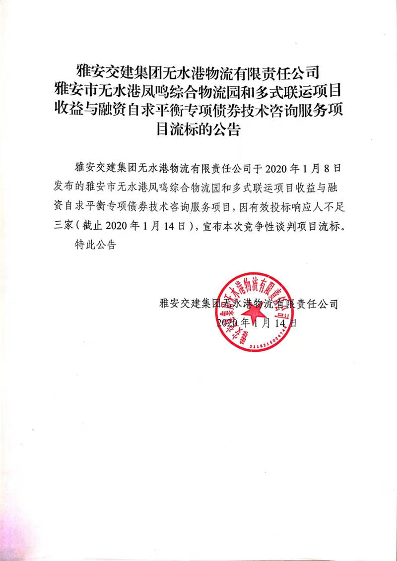 雅安交建集團無水港物流有限責任公司雅安市無水港鳳鳴綜合物流園和多式聯(lián)運項目收益與融資自求平衡專項債券技術(shù)咨詢服務項目流標的公告