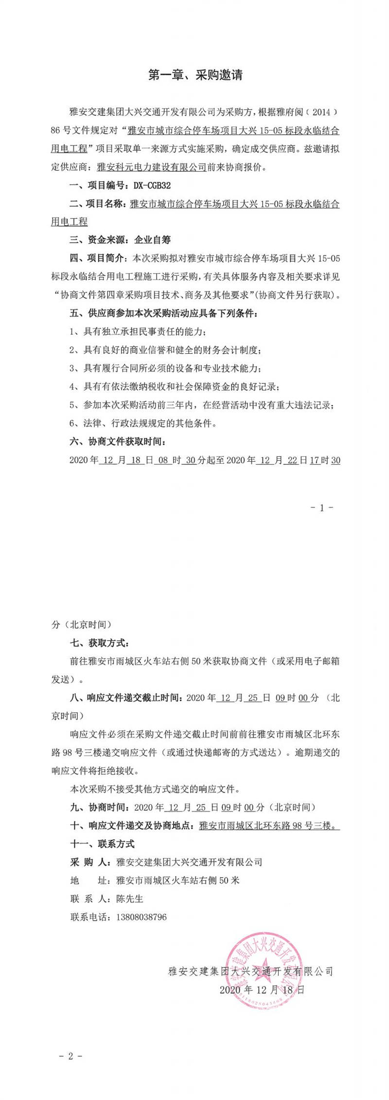 雅安交建集團大興交通開發(fā)有限公司雅安市城市綜合停車場項目大興15-05標段永臨結合用電工程單一來源采購邀請
