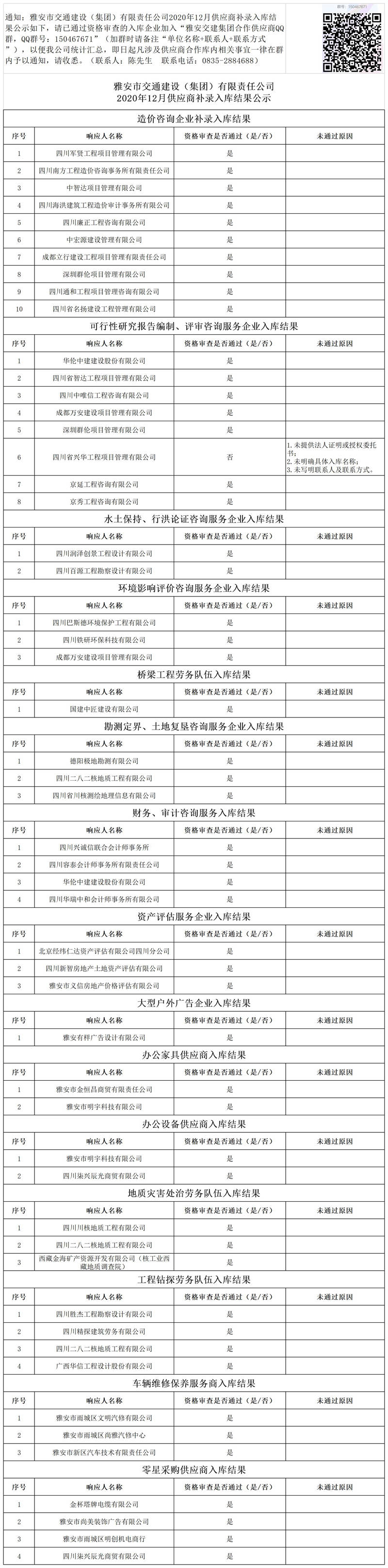 雅安市交通建設(集團)有限責任公司2020年12月供應商補錄入庫結(jié)果公示