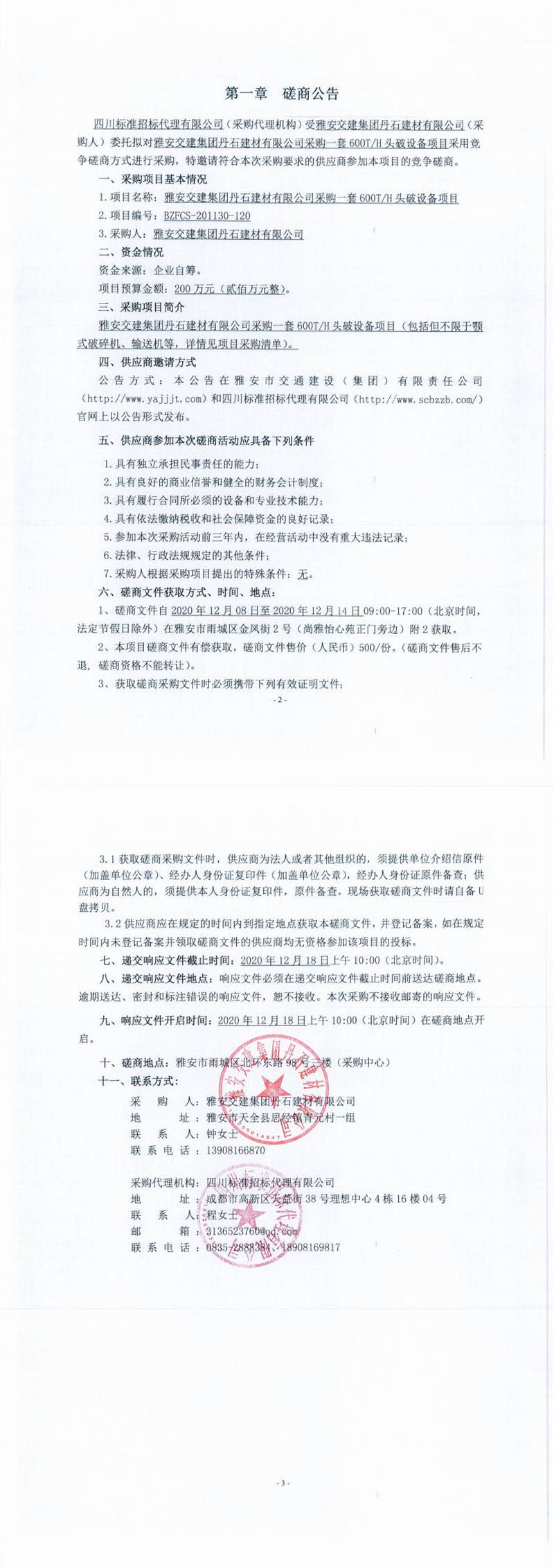 雅安交建集團(tuán)丹石建材有限公司采購一套600T/H頭破設(shè)備項目磋商公告