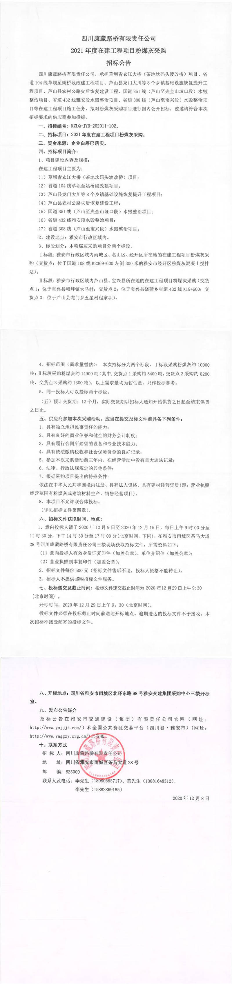 四川康藏路橋有限責(zé)任公司2021年度在建工程項(xiàng)目粉煤灰采購招標(biāo)公告