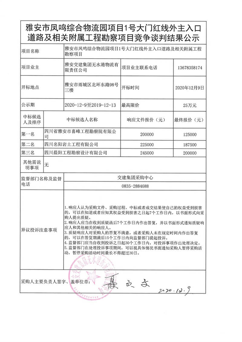 雅安交建集團無水港物流有限責(zé)任公司雅安市鳳鳴綜合物流園項目1號大門紅線外主入口道路及相關(guān)附屬工程勘察項目競爭談判結(jié)果公示