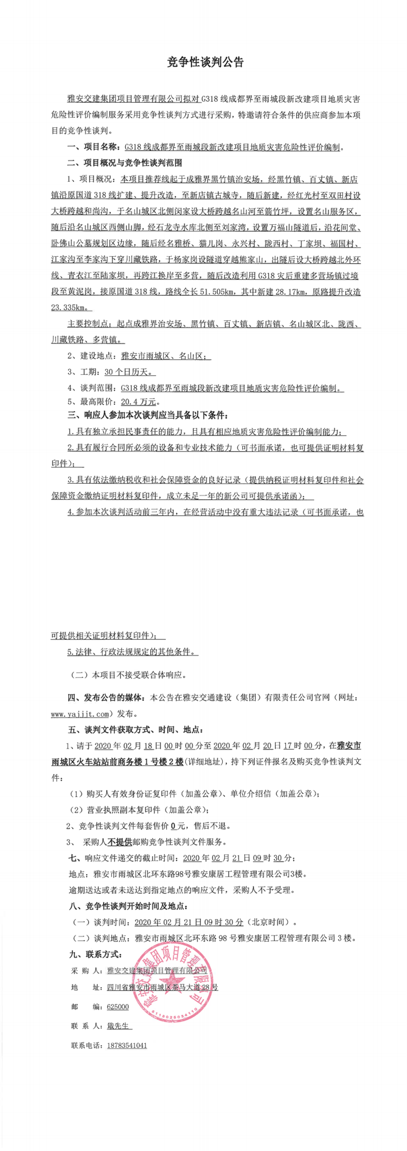 雅安交建集團(tuán)項(xiàng)目管理有限公司G318線(xiàn)成都界至雨城段新改建項(xiàng)目地質(zhì)災(zāi)害危險(xiǎn)性評(píng)價(jià)編制競(jìng)爭(zhēng)性談判公告