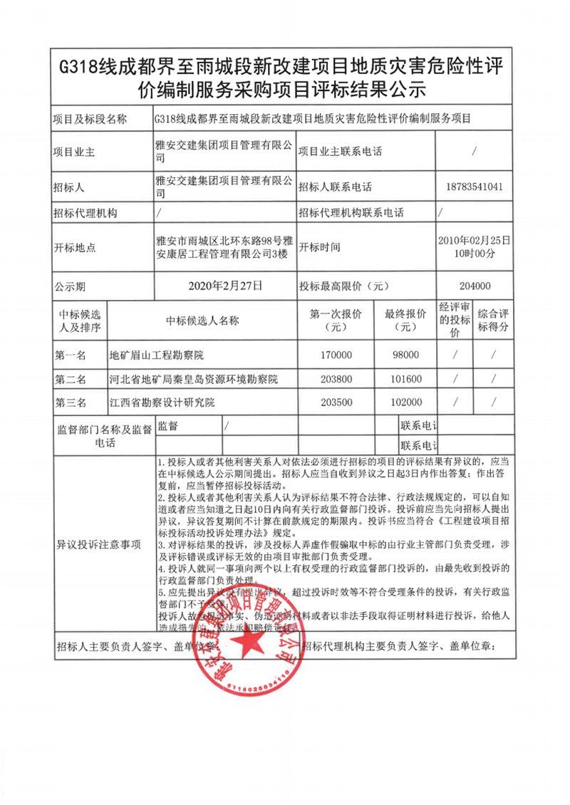 雅安交建集團(tuán)項(xiàng)目管理有限公司G318線成都界至雨城段新改建項(xiàng)目地質(zhì)災(zāi)害危險(xiǎn)性評(píng)價(jià)編制服務(wù)項(xiàng)目評(píng)標(biāo)結(jié)果公示