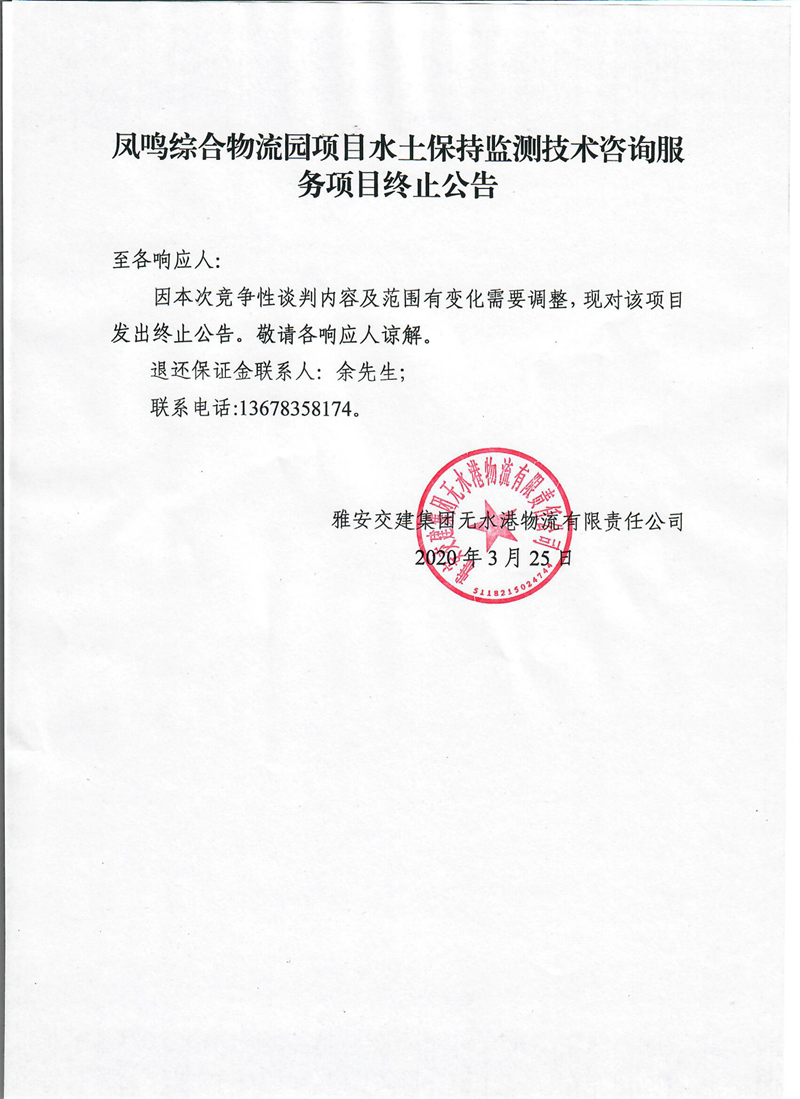 雅安交建集團(tuán)無水港物流有限責(zé)任公司鳳鳴綜合物流園項目水土保持監(jiān)測技術(shù)咨詢服務(wù)項目終止公告