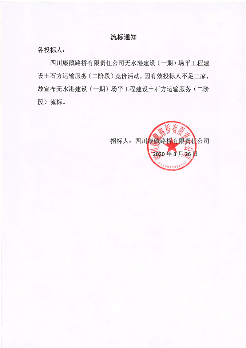 四川康藏路橋有限責(zé)任公司無水港建設(shè)(一期)場平工程建設(shè)土石方運輸服務(wù)(二階段)流標(biāo)通知