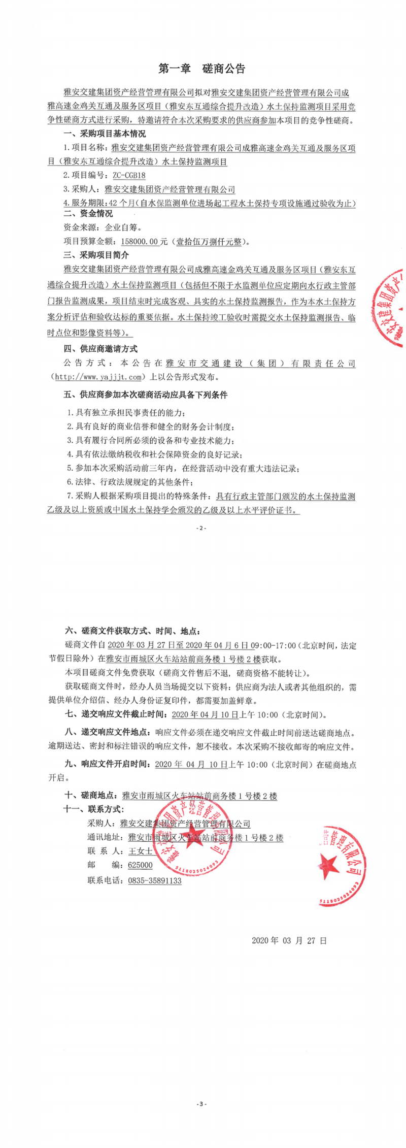 雅安交建集團資產經營管理有限公司成雅高速金雞關互通及服務區(qū)項目(雅安東互通綜合提升改造)水土保持監(jiān)測項目競爭性磋商公告