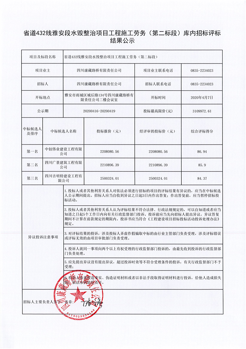 四川康藏路橋有限責任公司省道432線雅安段水毀整治項目工程施工勞務(第二標段)庫內(nèi)招標評標結(jié)果公示
