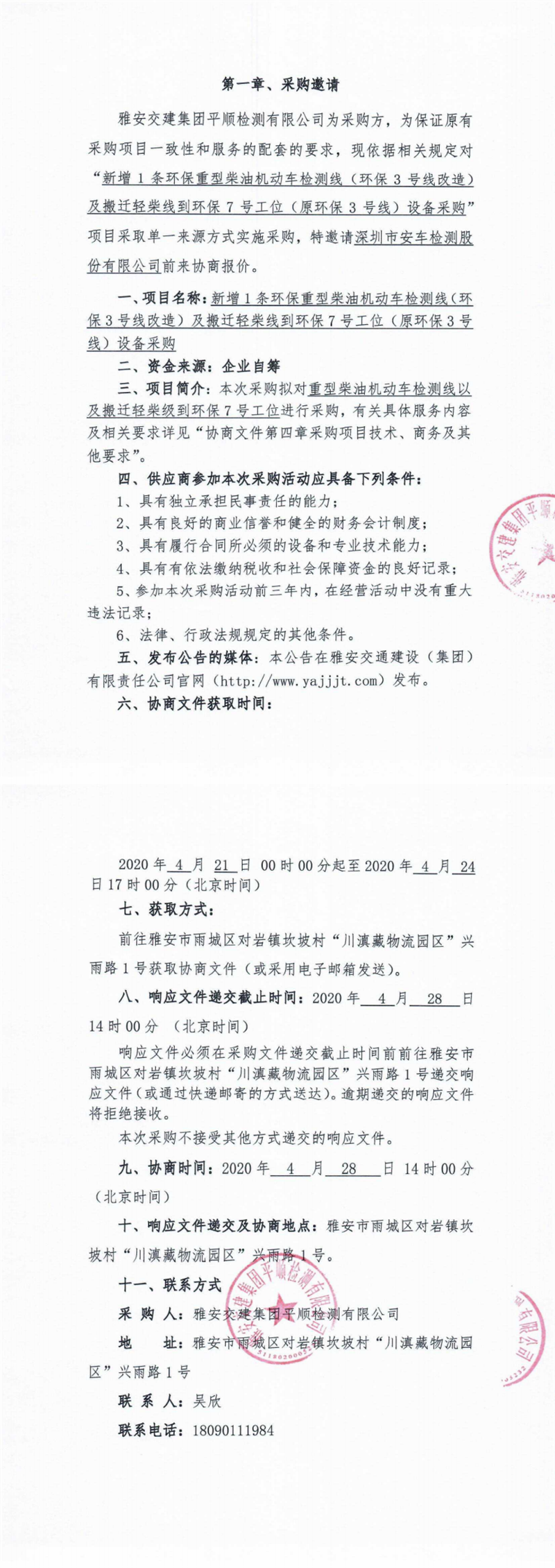 雅安交建集團(tuán)平順檢測有限公司新增1條環(huán)保重型柴油機(jī)動車檢測線(環(huán)保3號線改造)及搬遷輕柴線到環(huán)保7號工位(原環(huán)保3號線)設(shè)備采購單一來源協(xié)商公告