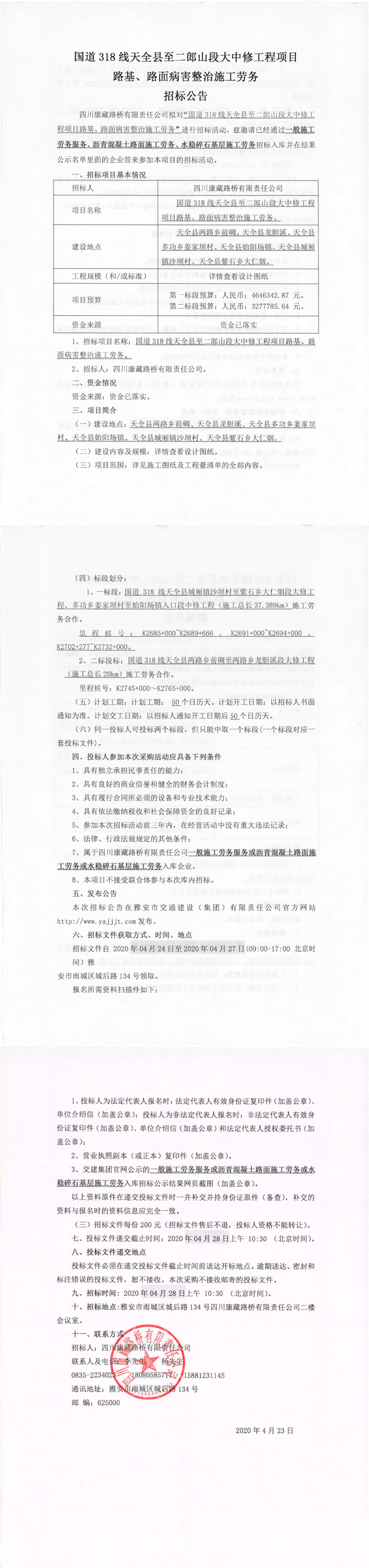 四川康藏路橋有限責(zé)任公司國道318線天全縣至二郎山段大中修工程項(xiàng)目路基、路面病害整治施工勞務(wù)招標(biāo)公告