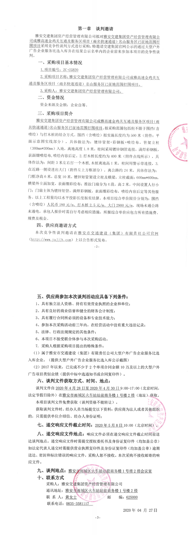 雅安交建集團資產(chǎn)經(jīng)營管理有限公司成雅高速金雞關(guān)互通及服務區(qū)項目(雨名快速通道)名山服務區(qū)已征地范圍打圍項目競爭性談判公告