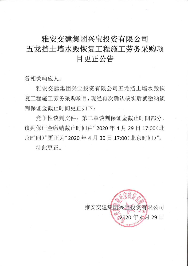 雅安交建集團(tuán)興寶投資有限公司五龍擋土墻水毀恢復(fù)工程施工勞務(wù)采購(gòu)項(xiàng)目更正公告