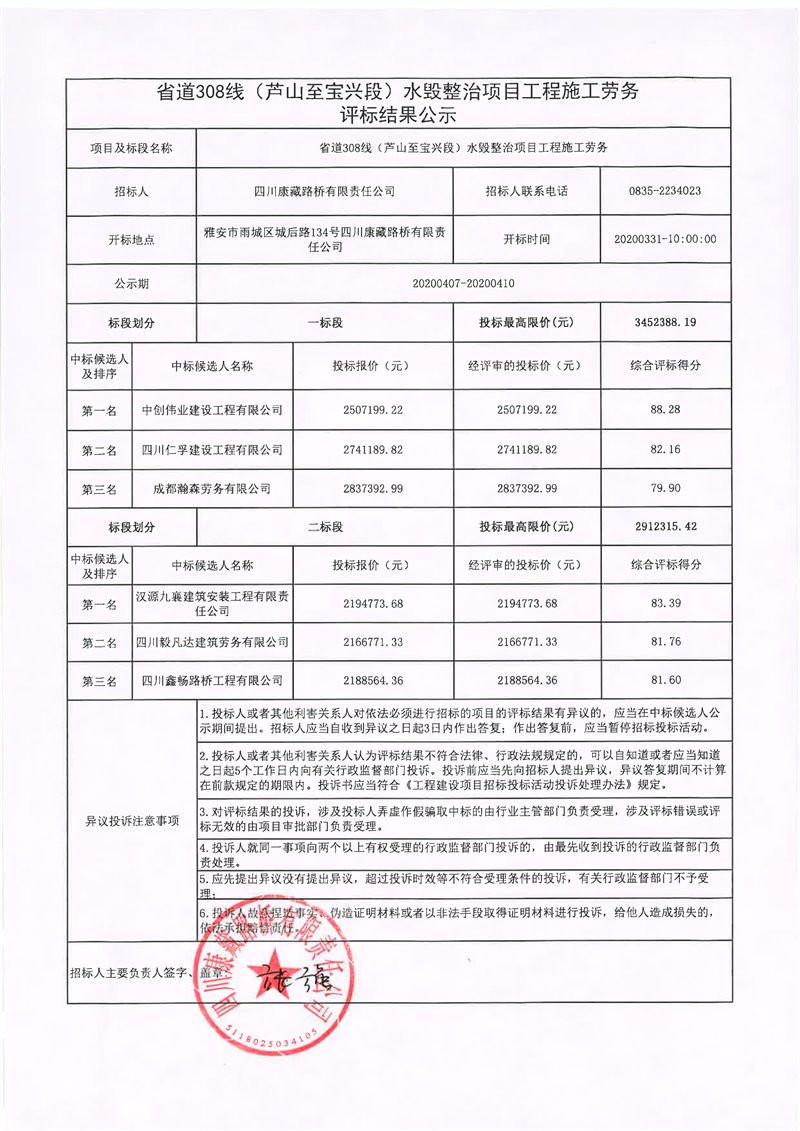 四川康藏路橋有限責任公司省道308線(蘆山至寶興段)水毀整治項目工程施工勞務(wù)評標結(jié)果公示