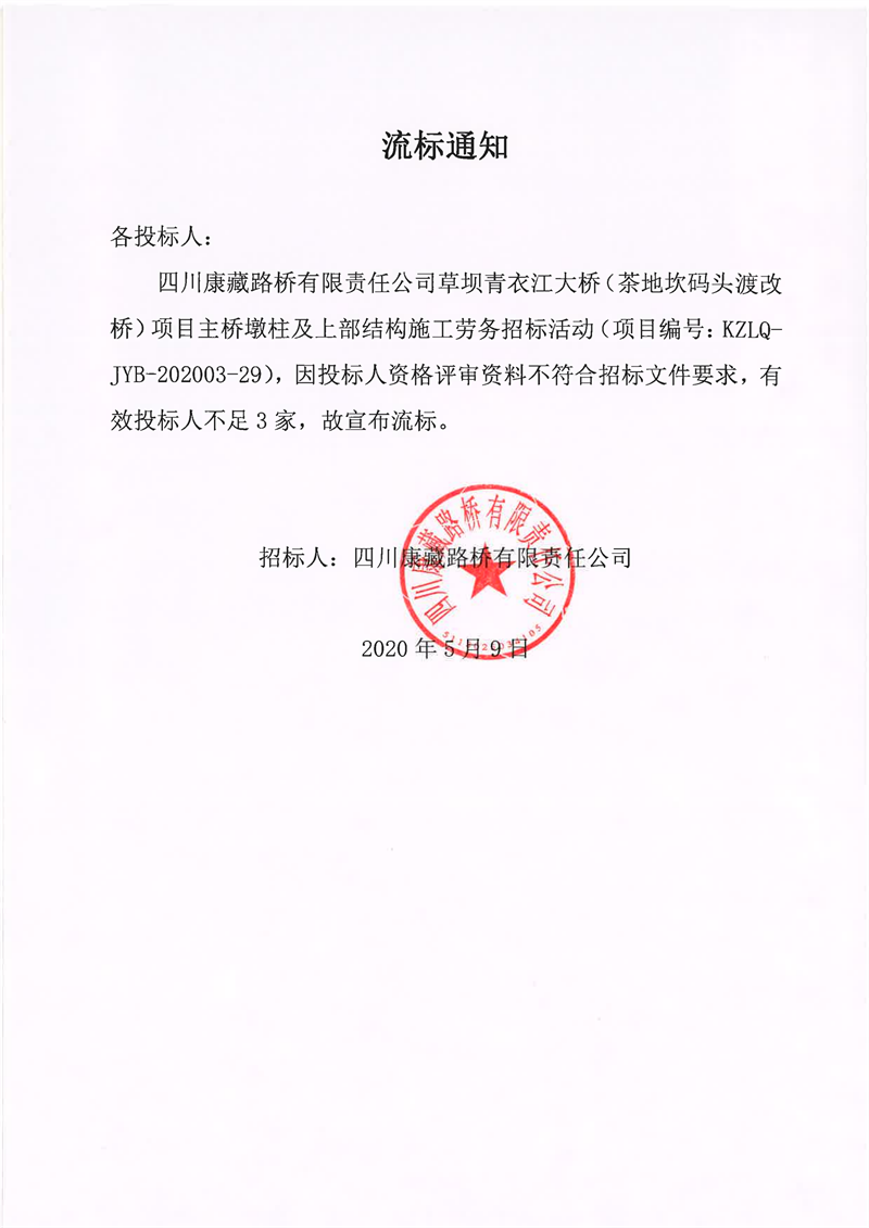 四川康藏路橋有限責任公司草壩青衣江大橋(茶地坎碼頭渡改橋)項目主橋墩柱及上部結構施工勞務流標通知