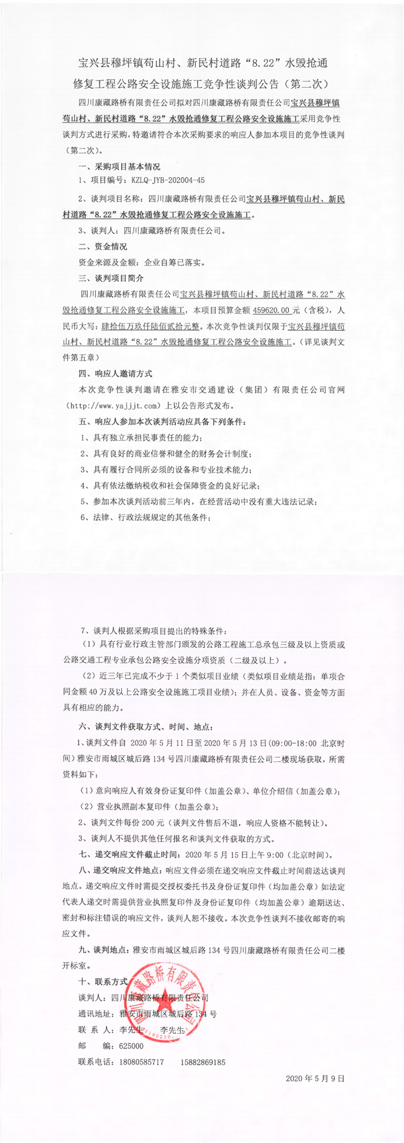 四川康藏路橋有限責任公司寶興縣穆坪鎮(zhèn)茍山村、新民村道路“8.22”水毀搶通修復(fù)工程公路安全設(shè)施施工競爭性談判公告(第二次)