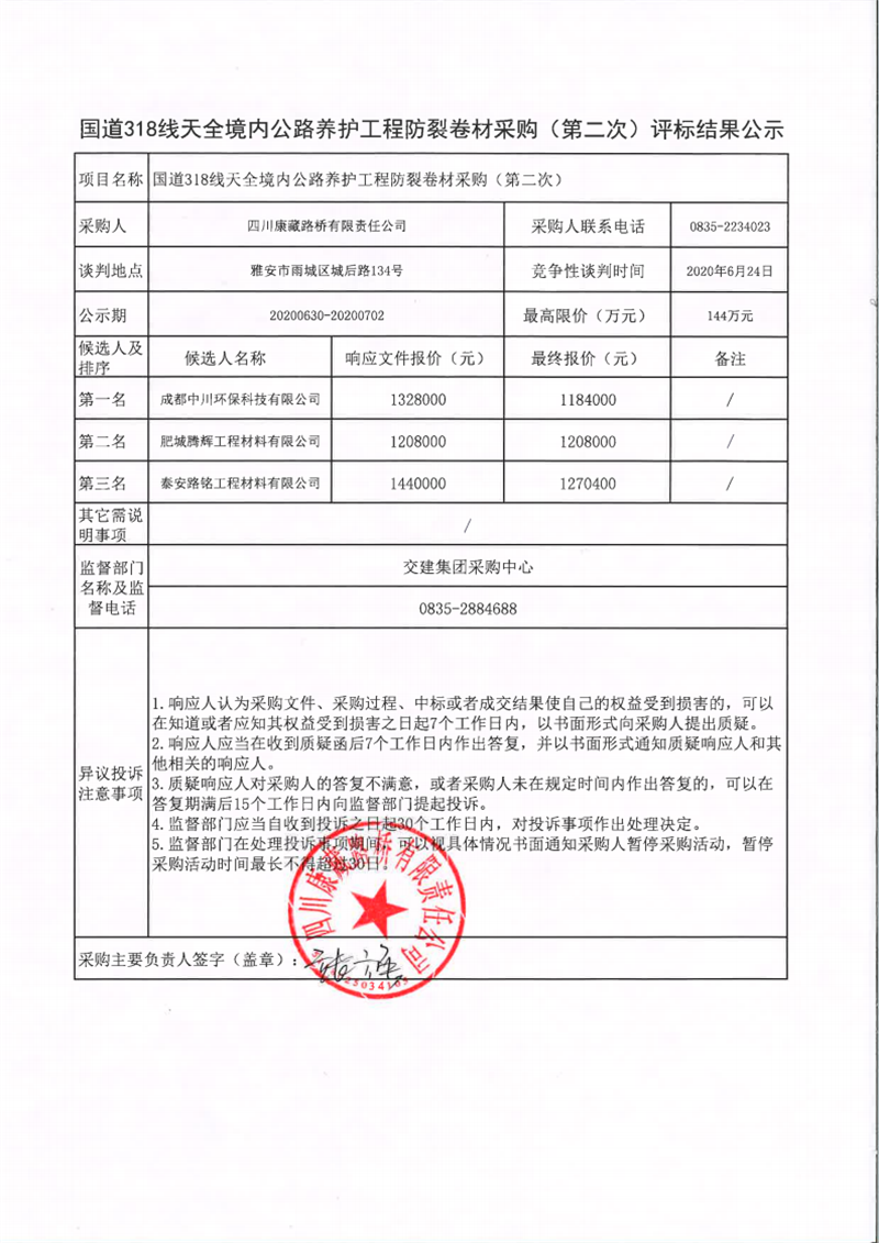 四川康藏路橋有限責任公司國道318線天全境內(nèi)公路養(yǎng)護工程防裂卷材采購(第二次)評標結果公示