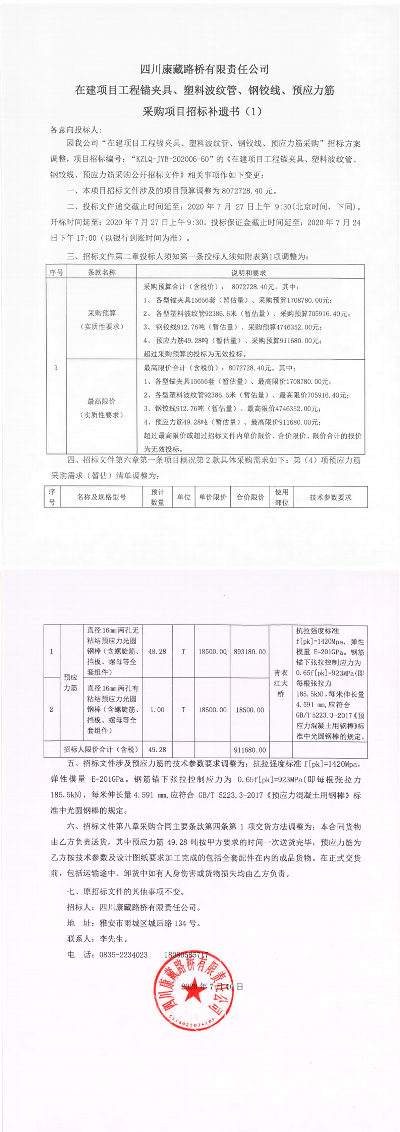 四川康藏路橋有限責(zé)任公司在建項(xiàng)目工程錨夾具、塑料波紋管、鋼鉸線(xiàn)、預(yù)應(yīng)力筋采購(gòu)項(xiàng)目招標(biāo)補(bǔ)遺書(shū)(1)