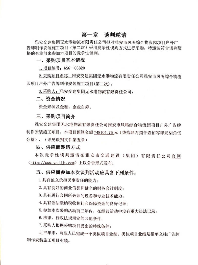 雅安交建集團(tuán)無水港物流有限責(zé)任公司雅安市鳳鳴綜合物流園項(xiàng)目戶外廣告牌制作安裝施工項(xiàng)目(第二次)競(jìng)爭(zhēng)性談判公告
