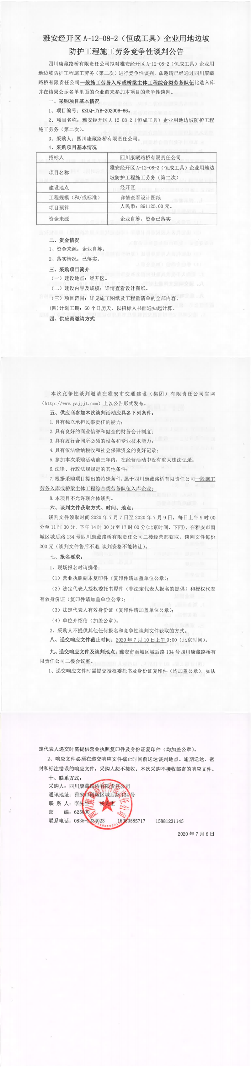 四川康藏路橋有限責(zé)任公司雅安經(jīng)開區(qū)A-12-08-2(恒成工具)企業(yè)用地邊坡防護(hù)工程施工勞務(wù)(第二次)競爭性談判公告