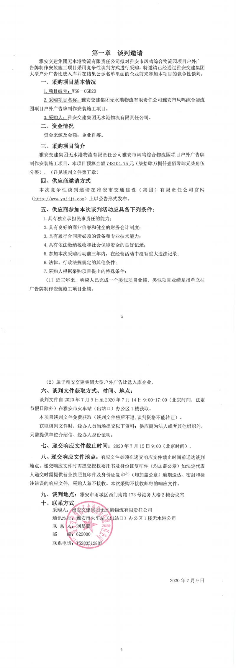 雅安交建集團無水港物流有限責(zé)任公司雅安市鳳鳴綜合物流園項目戶外廣告牌制作安裝施工項目競爭性談判公告