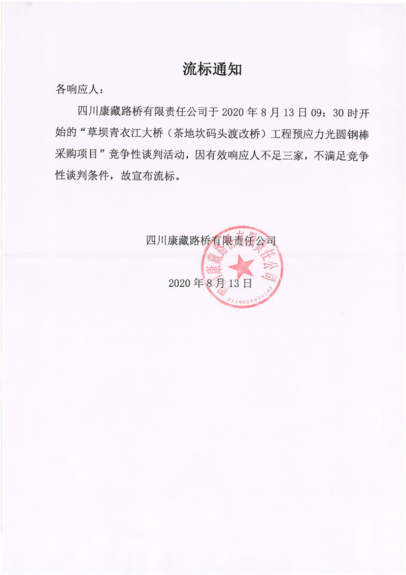 四川康藏路橋有限責(zé)任公司草壩青衣江大橋(茶地坎碼頭渡改橋)工程預(yù)應(yīng)力光圓鋼棒采購項目流標(biāo)通知