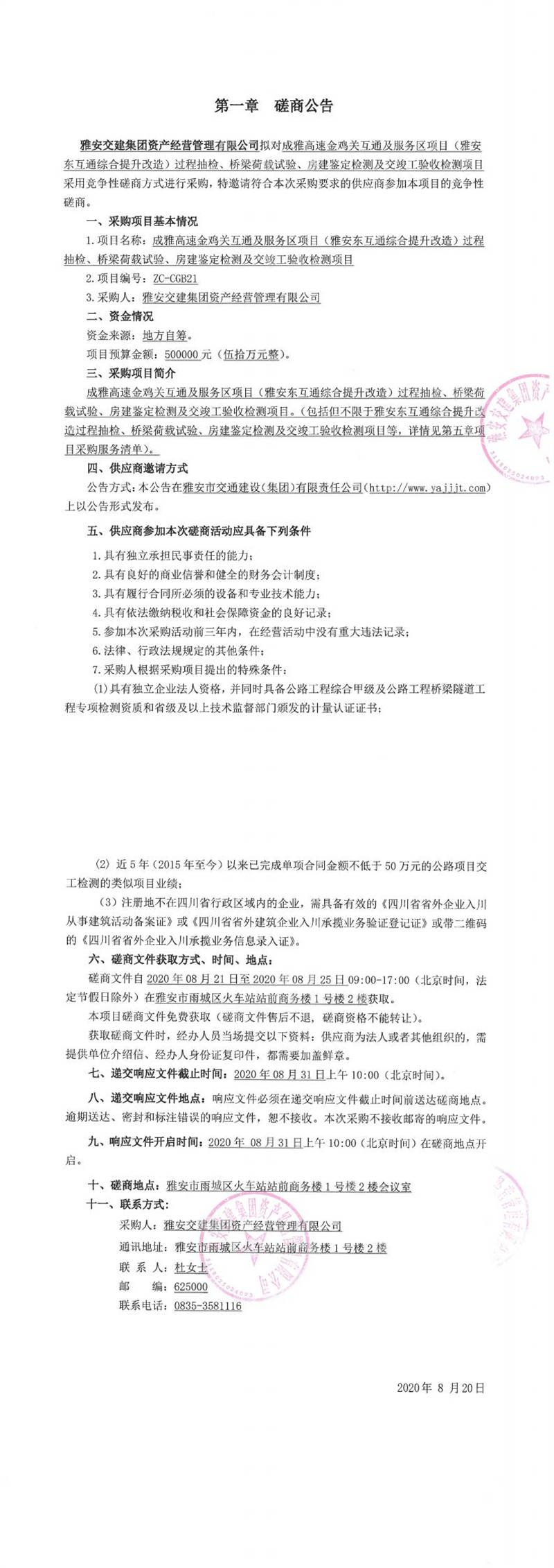 雅安交建集團(tuán)資產(chǎn)經(jīng)營(yíng)管理有限公司成雅高速金雞關(guān)互通及服務(wù)區(qū)項(xiàng)目(雅安東互通綜合提升改造)過程抽檢、橋梁荷載試驗(yàn)、房建鑒定檢測(cè)及交竣工驗(yàn)收檢測(cè)項(xiàng)目磋商公告