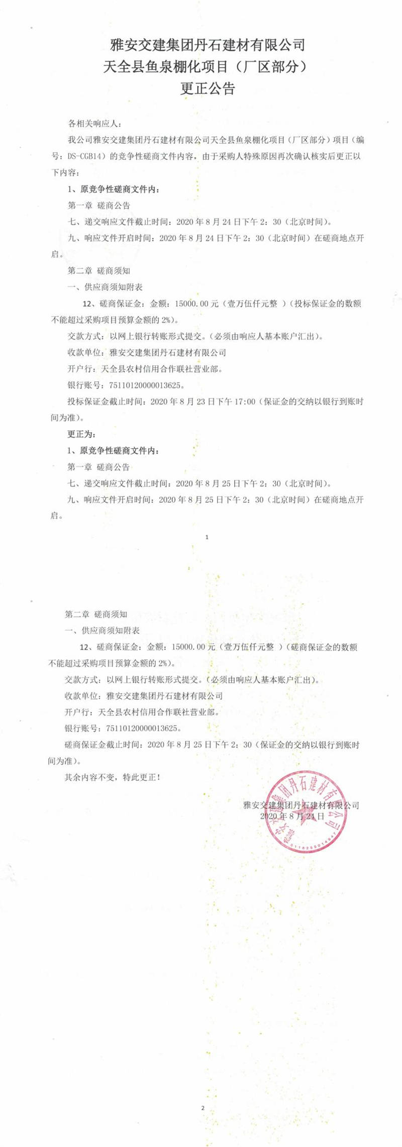 雅安交建集團(tuán)丹石建材有限公司天全縣魚泉棚化項目(廠區(qū)部分)更正公告