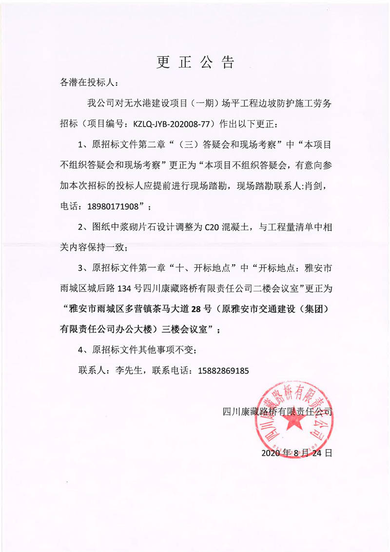 四川康藏路橋有限責(zé)任公司無水港建設(shè)項目(一期)場平工程邊坡防護施工勞務(wù)招標(biāo)更正公告