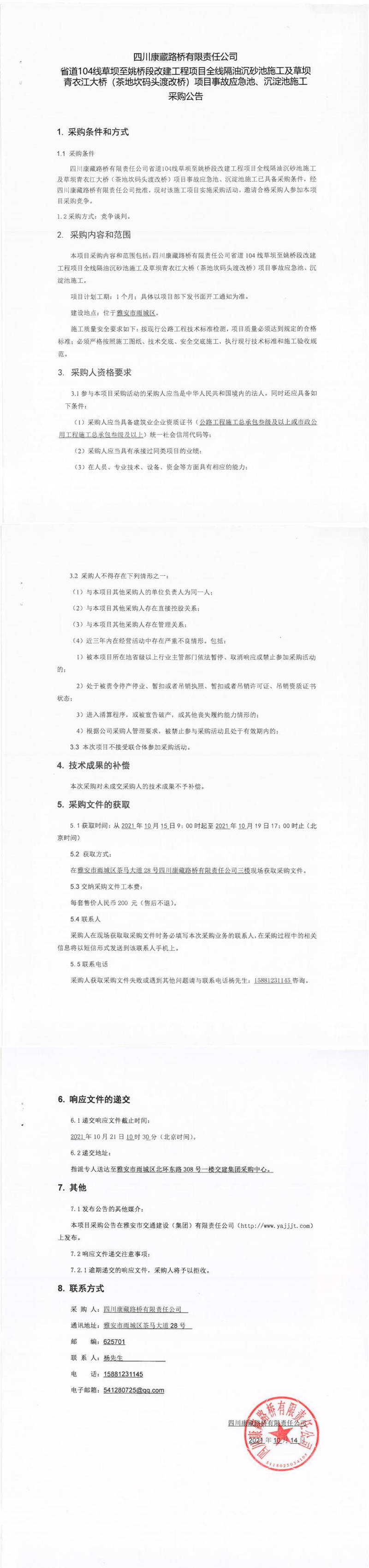 四川康藏路橋有限責任公司省道104線草壩至姚橋段改建項目全線隔油沉砂池施工及草壩青衣江大橋(茶地坎碼頭渡改橋)項目事故應(yīng)急池、沉淀池施工采購公告