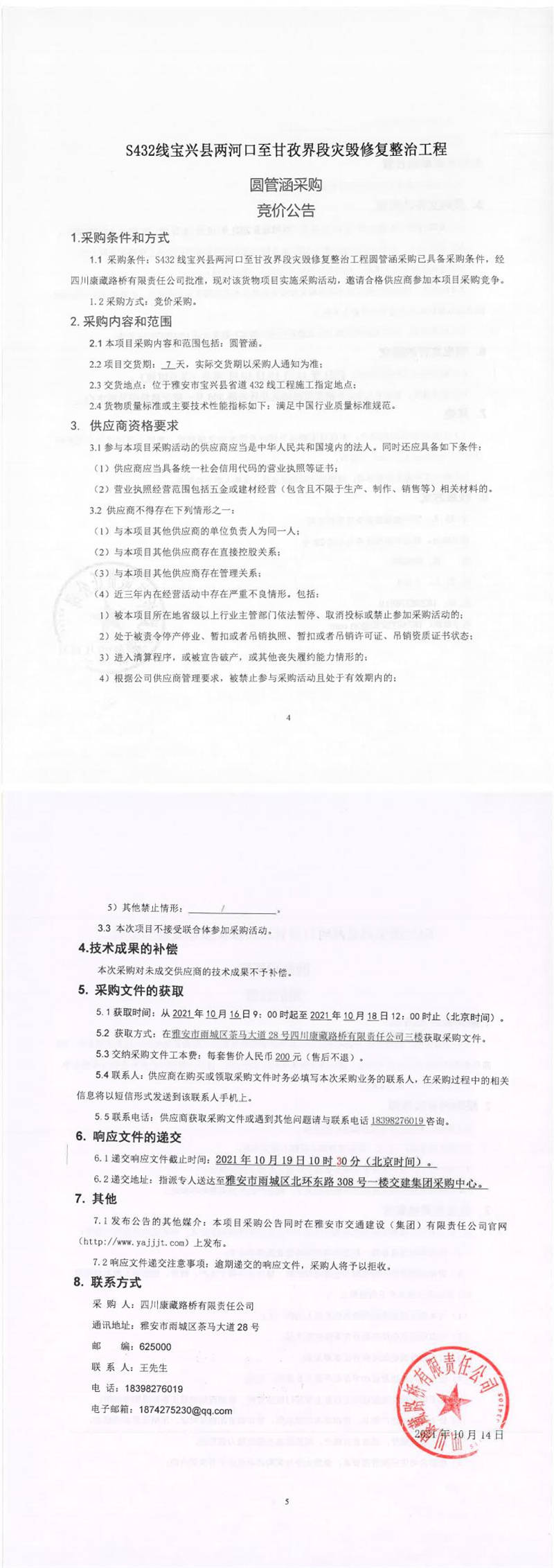 四川康藏路橋有限責(zé)任公司S432線寶興縣兩河口至甘孜界段災(zāi)毀修復(fù)整治工程圓管涵采購競價(jià)公告