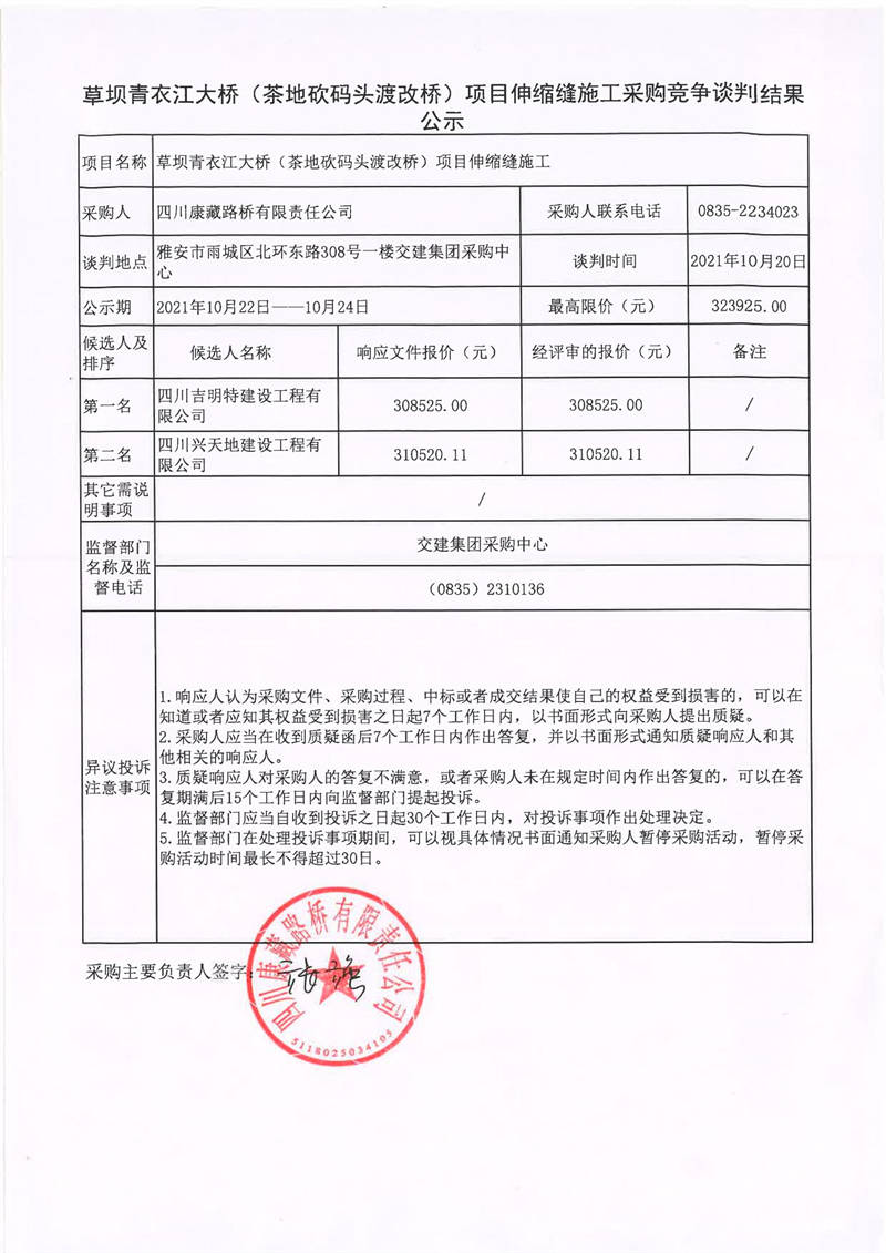 四川康藏路橋有限責(zé)任公司草壩青衣江大橋(茶地坎碼頭渡改橋)項(xiàng)目伸縮縫施工采購競爭談判結(jié)果公示