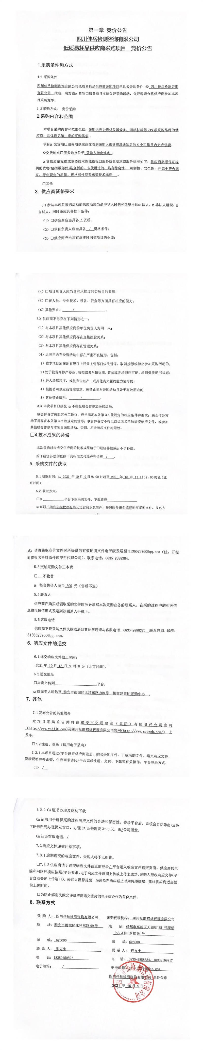 四川佳岳檢測(cè)咨詢(xún)有限公司低質(zhì)易耗品供應(yīng)商采購(gòu)項(xiàng)目競(jìng)價(jià)公告