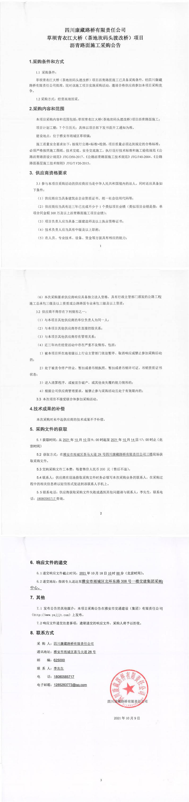 四川康藏路橋有限責(zé)任公司草壩青衣江大橋(茶地坎碼頭渡改橋)項目瀝青路面施工采購公告